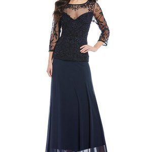 Pisarro Nights Sheer Beaded Bodice 3/4 Sleeve Gown