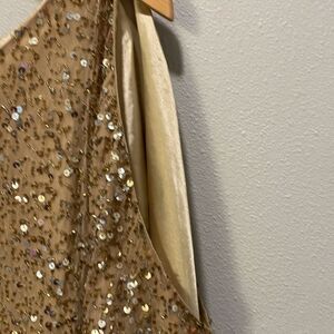 Pisarro Nights woman gold beaded silk dress. This dress is gorgeous and the attention to detailing is amazing. The sleeves are slitted. This dress is a size 10.