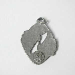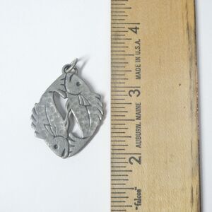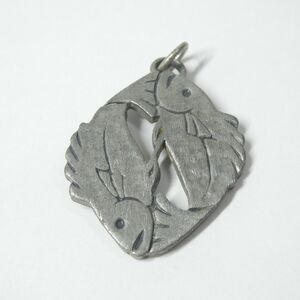 Vintage pisces pendant. Made of a silvertone metal, possibly pewter. Signed on back, though I dont recognize the makers mark. Measures about 1.25 inches tall. Good shape overall, with some surface wear from use.