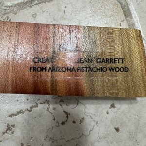 Dean Garret local Arizona Artist. Pistachio Wood from Arizona. I was president of Arizona Pistachio Company for 10 years. During that time I harvested the logs of all the trees we had to remove. The wood is very hard and often unstable. However I was able to have over 4 pallets of wood milled into lumber. Normally the trunks are very short and include both some fruit (nut) wood and root stock from which we do grafting. So often there is not a great deal of nut wood itself. Many cracks that I fill with epoxy much like mesquite. Our new bathroom and closet has a lot of pistachio used in the finish. It is beautiful. I have made soom furniture, crosses and lazy susans from this wood.