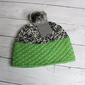 This chunky sweater knit hat is gorgeous quality and made of wool. It is black, natural off white and green. It has a faux fur pom pom with metal logo. The inside of the hat is lined with soft green fleece fabric. It's a beautiful beanie and I think you'll love it!