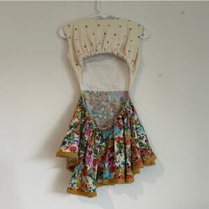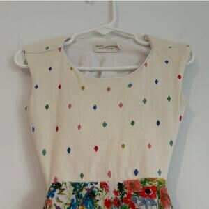 Design: The top part of the dress is a lovely cream color with diamond-shaped polka dots. The bottom boasts a bright and cheerful floral pattern. It features a flowy skirt with beautiful ribbon trim and a cute cut-out back.