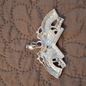 This is a pistols pendant with clear rhinestones. It has a large bale, so it could take up to a large chain. It is 2 and 1/2 in by one and a half inches. This would make a great gift for the shooting enthusiast that you might know.