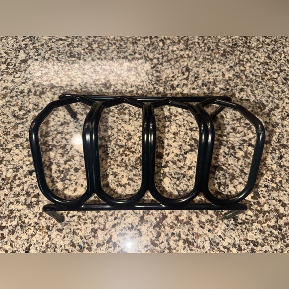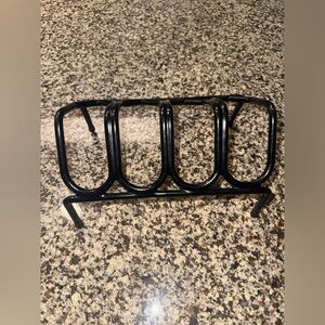 Sleek black metal wall rack. Perfect for organizing spaces.