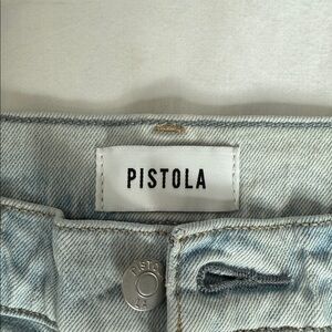 High waist, very light blue wash. Distressed in small areas pictured. Has stretch. Inseam 31”