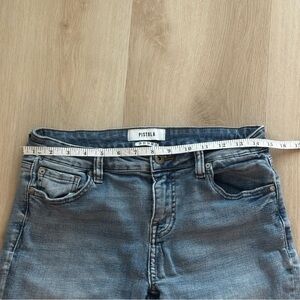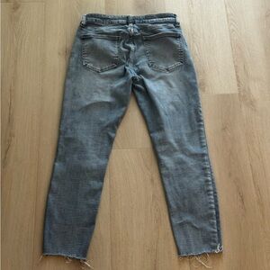 Stylish cropped jeans with a washed look. Features a frayed hem for a trendy touch.