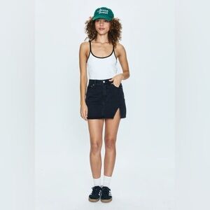 The Pistola Rhea Mini Skirt in Voltaire is a sleek, black denim essential designed for repeat wear. With a mid-rise fit, front notch detail, and gently faded charcoal wash, it’s the kind of piece that instantly elevates a simple cute outfit.