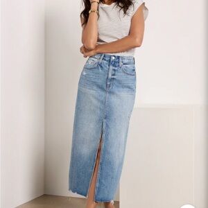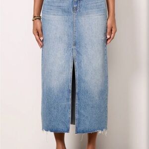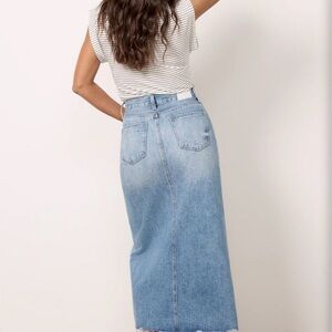 Alice midi skirt. Stylish blue denim. Features a front slit. Perfect for casual wear. Runs true to size.