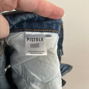 These Pistola jean shorts in a classic blue wash boast a distressed hem and a relaxed fit, perfect for a laid-back summer vibe. The vintage-inspired design adds a timeless touch to your casual wardrobe.