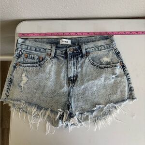Pistola blue jean shorts with a distressed, cut-off style and frayed edges in a light blue wash.