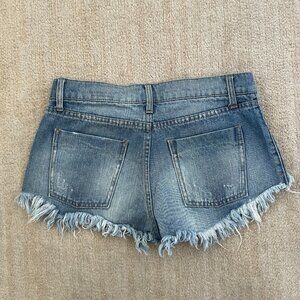 Blue ripped / distressed jeans denim shorts. Fabric does not have stretch. Brand sold on Revolve