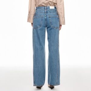 High rise denim with a relaxed, wide leg silhouette and full length hem. Defined by a double stacked waistband and elevated side seam details.