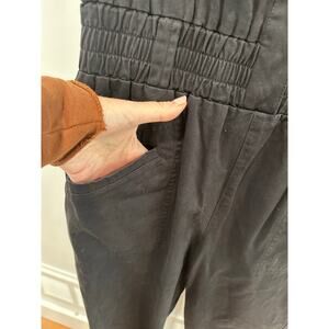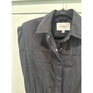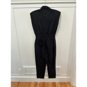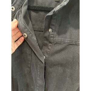 Black. 100% cotton. Snap front. Front and back pockets. Elastic waist. Shoulder pads.