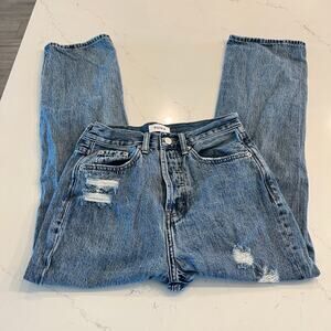 In good used condition. No stains. One small nick in the fabric- please see photo. High rise. 26" inseam. Button Fly. Color/Wash: Elixir. Women's size 25.
