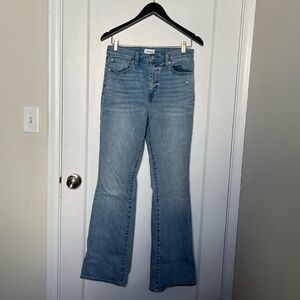 "High rise distressed jean. Button and zipper fly. Five pocket construction. Classic flare with a subtle stretch. Hugs you from waist to knee and flares out at the ankle. Comfort stretch. True to size.