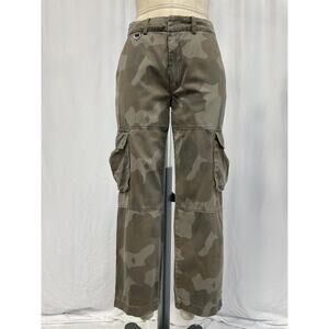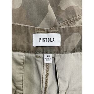 Pistola Denim 'Addie' Green Cotton Pants Size 26: lightweight, non-stretch twill, cargo pockets, camo print, button closure and zip fly, slant hip pockets and patch back pockets.
