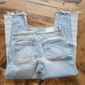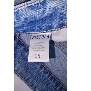 Pistola Distressed Two-Tone Mid-Rise Straight Leg Jeans Size 28. Two tone light and dark wash, frayed hems, distressed retro look. Excellent condition.