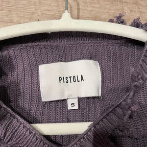 Eva sweater from Pistola in a lovely purple color with intentional fading. Pullover crewneck style with a shaker stitch knit and intentional distressing on the hem, cuffs, and neckline. Size small but it's intentionally oversized, it measures almost 30 inches pit-to-pit and about 23 inches long (see pictures for exact measurements. Excellent used condition and made of 100% cotton knit fabric.