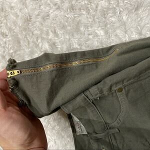 Features: olive green ankle length raw hem Jeans with ankle zippers