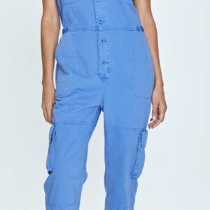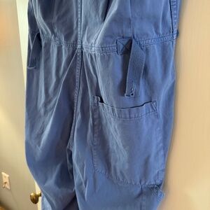 All-in-one outfitting, expertly realized in our best selling jumpsuit silhouette. Designed for a relaxed fit, with a button up bodice and waist for adjustable coverage and fit options. Ocean Blue is a muted, true blue colorway adorned with flap side pockets on the lower legs and cargo inspired styling notes.