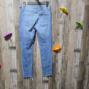 Details: stretchy, high waisted, zipper and button closure, factory distress and raw hems, light wash, skinny fit