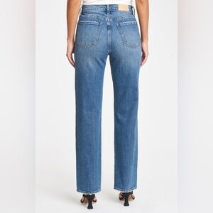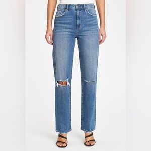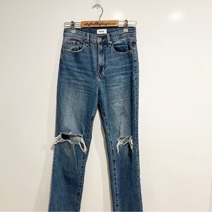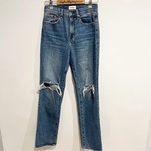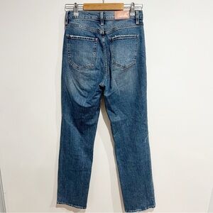Faded and distressed super high rise straight leg jean. Button and zipper fly. Five pocket construction. True to size.