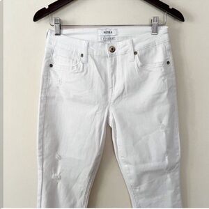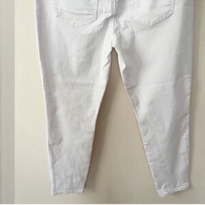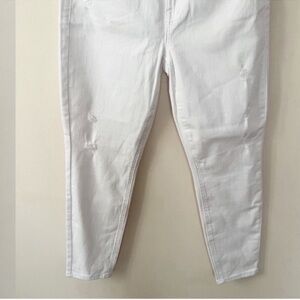 Excellent condition. White jeans. Skinny leg. High rise. Zipper/button closure. Small amount of distressing. Five pocket denim.
