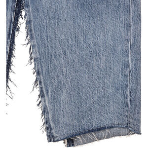 Asymmetrical hem with right side longer than left.