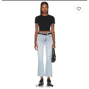 Pistola Lennon High Rise Boot Jean Raw Hem Light Wash Distressed Cropped 26. Distressing. Raw edge hem. Crop boot cut ankle jeans. High waisted denim. Stretch denim.