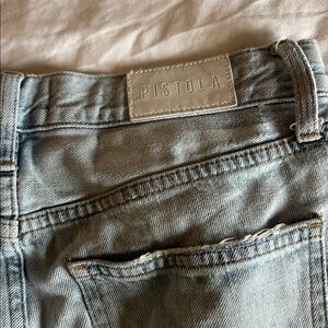 Trendy light blue denim with a classic button fly. Ideal for everyday style. Has wear but still in good condition