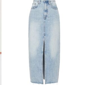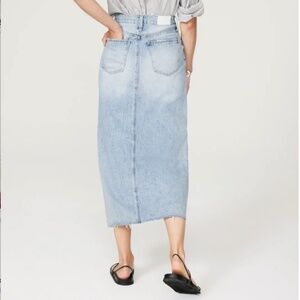 On-trend midi skirt created from a rigid, non-stretch cotton denim and features a raw hem, center slit detail, and a hint of distressing. Designed into a slightly longer midi length, it looks more polished and has the fashionable function of a front slit for freedom of movement. Looks good with everything from a polished blazer to your favorite crop top.