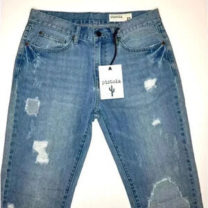 Stylish light blue jeans. Distressed details. Ankle length. Perfect for casual wear.