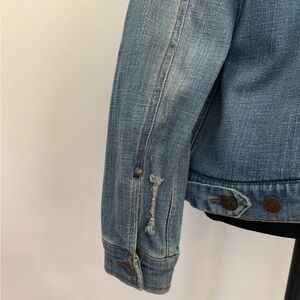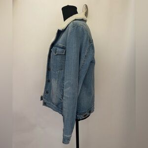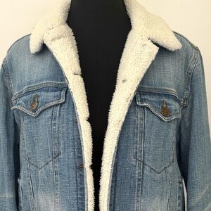 The interior and collar are lined with a soft, white sherpa fleece, providing warmth and a distinctive look. The outer shell is made of denim, typically in a blue, light-wash color and features a button-up closure, a collared neckline, and two front pockets. Approximate flat measurements; length 21”, armpit to armpit 19”, sleeve length 23.5”