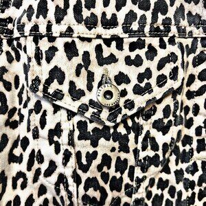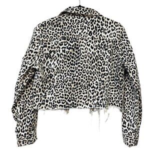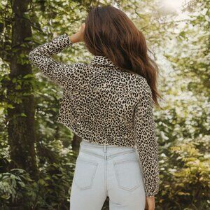 ✨Say hello to your new favorite layering piece. This cropped denim jacket features a cool Leopard Animal print all over, giving you a classic look. Slightly cropped long sleeve, button down closure and raw hem for a cool look.