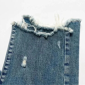 High rise faded and distressed mom jean. Button fly closure. Five pocket construction. Frayed hem. Material: Cotton/Spandex