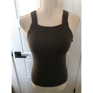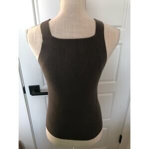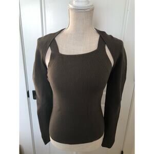 This versatile piece is stylish and functional. It is an olive two-piece knit set that is minimalist in design. The knit set features a tank with a removable shrug, making it perfect for mixing your style up or if to warm, being comfortable. It is perfect for dressing up or down. The neckline is a high square neckline so it provides coverage. The knit material has a ribbed style and some stretch. New with tags.