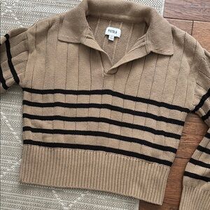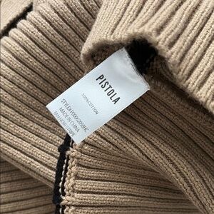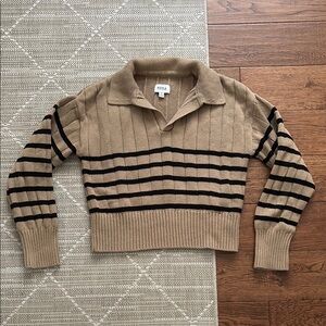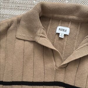 Stylish v-neck sweater by Pistola. Tan with black stripes. Ribbed texture. Perfect for layering.