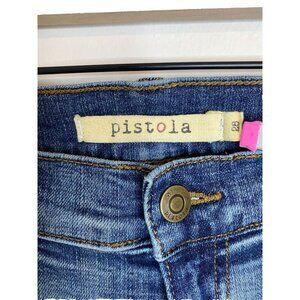 These are Pistola Ultra Flare Bell Bottom Frayed Hem Distressed Jeans in size 28. They are blue denim jeans with a mid-rise waist of about 30 inches. Made of cotton, they feature a flared style with a 33-inch inseam. The jeans have a zip closure and distressed accents, perfect for a stylish and edgy look.