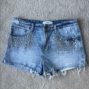 Keywords: Pistola shorts, rhinestone shorts, cutoff denim, mid rise shorts, high rise shorts, women’s size 28, summer shorts, festival