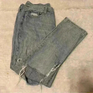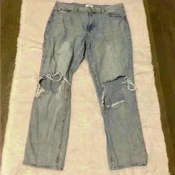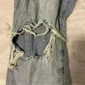 These sought after jeans are a size 32. The ripped design is more prominent in one of the knees as shown in the picture.