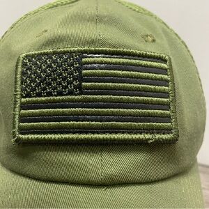 Stylish olive green cap with a flag patch. Perfect for casual wear.