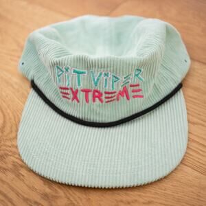 Teal Pit Viper Extreme trucker hat; material is corduroy, hat manufacturer is Groomer; One size, strap is adjustable (and very cool).