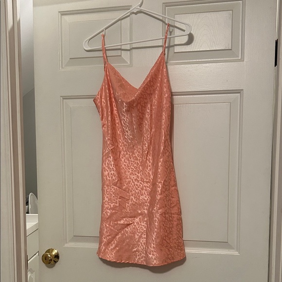Stylish mini dress with a leopard pattern. Features a vibrant coral color. Perfect for a night out.