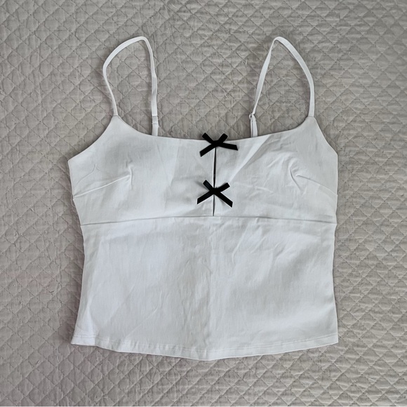 This elegant white top features delicate spaghetti straps and stylish black bow accents, perfect for a chic and modern look. Ideal for any occasion, this top combines comfort with a touch of sophistication.