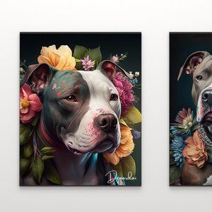 These stunning pitbull prints brings together the grace and strength of this magnificent breed with the beauty of nature. The prints features powerful and confident pitbulls, surrounded by a lush and intricate floral design, creating a harmonious and captivating composition. The vibrant colors and intricate details of the flowers add a touch of elegance and sophistication to the artwork, making it a perfect fit for any home decor.
