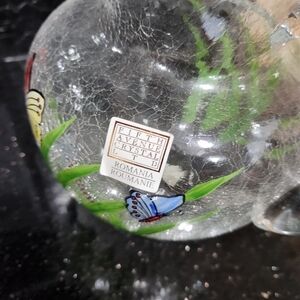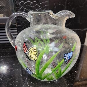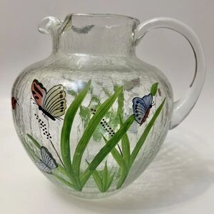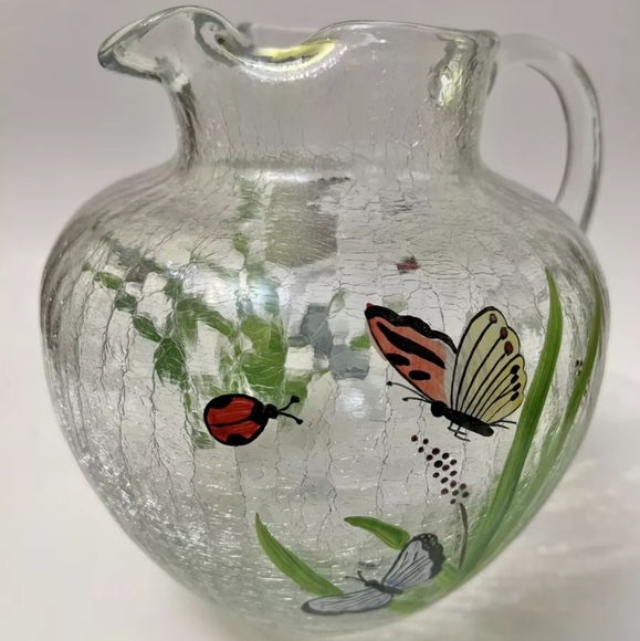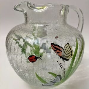 Crackled Glass Pitcher “Papillion” Butterfly Lady Bug Pattern Hand painted with Applied Handle by Fifth Avenue Crystal.