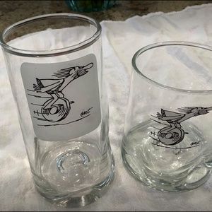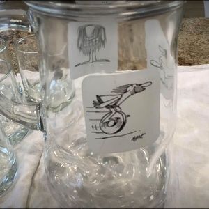 This is a rare set, Vintage BC Comic Johnny Hart Caveman Pinched Glass Pitcher, 9 glass Tumblers and 10 ice tea glasses. BC fans: this is a must. Here are some of your favorite characters ready to hold your iced tea or favorite drink. The pitcher is 9 1/4" tall, has 3 characters on it, and the glasses with one character. Pitcher and glasses have the "thumbprint" indentation around the base. No chips or cracks.