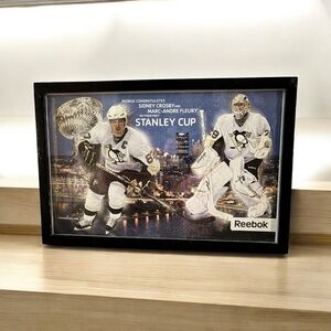 Own a piece of hockey history with this RARE Pittsburgh Penguins 2009 Stanley Cup Framed Poster by Reebok! Featuring Sidney Crosby and Marc-André Fleury, this 12x18 collectible celebrates their first Stanley Cup win against the Detroit Red Wings. The stunning design includes the Pittsburgh skyline in the background, making it a must-have for any Penguins fan or NHL memorabilia collector.