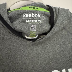 The Pittsburgh Penguins Hockey Sweatshirt from Reebok is a size XL with a solid gray color and a long sleeve design. Made of polyester knit fabric, it features the team's logo as accents, perfect for fans looking to show their support for the Penguins. This pullover hoodie is machine washable and ideal for the winter, fall, and spring seasons. With a regular fit, it is a comfortable and stylish addition to any man's wardrobe, suitable for both casual wear and ice hockey activities.