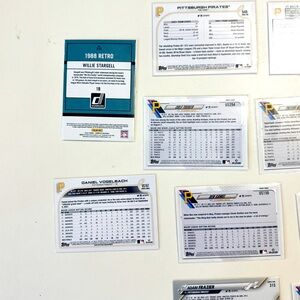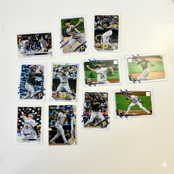 This product is a lot of 11 baseball trading cards featuring players from the Pittsburgh Pirates team. Made by Topps and Donruss, these cards are from the 2020-2022 season of the Major League (MLB). Each card is standard size and were manufactured in the United States. Perfect for collectors or fans of the Pittsburgh Pirates looking to add to their sports trading card collection.